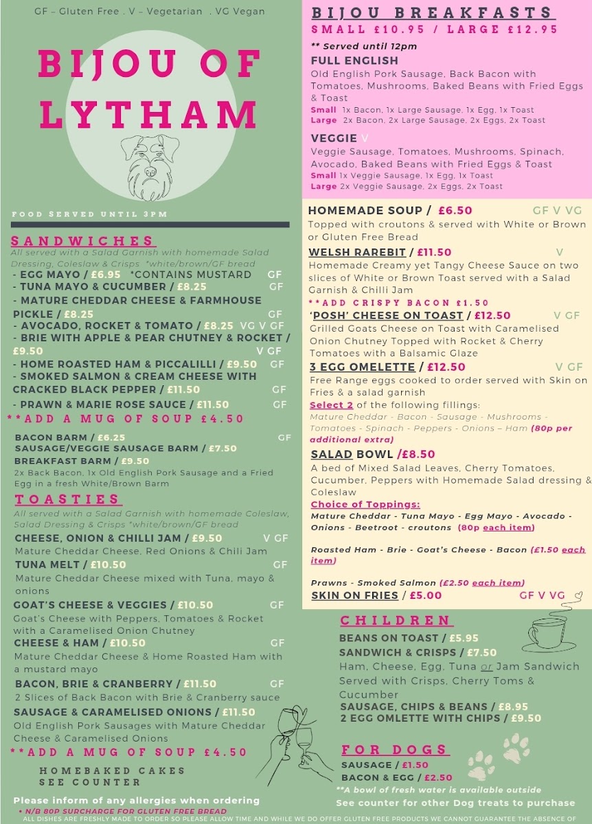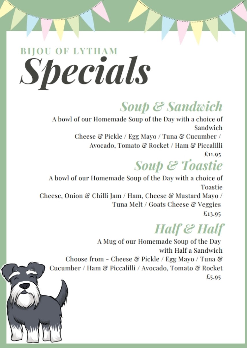 From a reviewer’s perspective, the menu at Bijou Of Lytham offers a comforting and well-curated selection of classic café-style dishes that feel both familiar and satisfying. The sandwich range, including Tuna Mayo & Cucumber, Brie With Apple & Pear Chutney & Rocket, and the hearty Breakfast Barm, provides simple yet appealing choices for a light meal. The breakfast section stands out with options like the Full English, alongside lighter alternatives such as Homemade Soup, Welsh Rarebit, Salad Bowl, and Skin On Fries, catering to different appetites throughout the day. Toastie lovers are particularly well served, with flavorful combinations such as Cheese, Onion & Chilli Jam, Tuna Melt, Goat's Cheese & Veggies, Cheese & Ham, and Bacon, Brie & Cranberry, each offering a warm, indulgent bite. For younger diners, the inclusion of Beans On Toast and Sausage, Chips & Beans keeps things simple and family-friendly. The specials elevate the menu with more distinctive options like the Retro Prawn Cocktail Topped With Smoked Salmon And Served With A Slice Of Bread And Butter and Lanigans Home Potted Shrimps Served With Bread And Butter And A Side Salad, adding a touch of tradition and seafood flair. Finally, combination deals such as Soup & Sandwich, Soup & Toastie, and Half & Half provide flexible, value-oriented choices. Overall, the menu strikes a balance between comfort food classics and thoughtful variety, making it an inviting spot for casual dining.